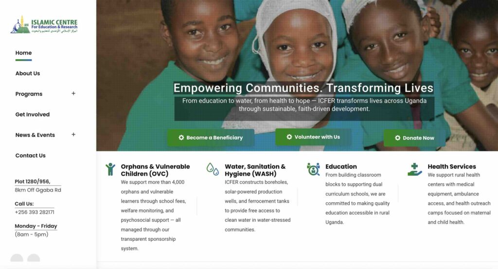 ICFER Uganda is a non-governmental organization dedicated to improving livelihoods through programs in Health, Water & Sanitation, Education & Dawa, Family Support, Mosque Programs, Food & Nutrition, Climate Action, and Orphans & Vulnerable Children.